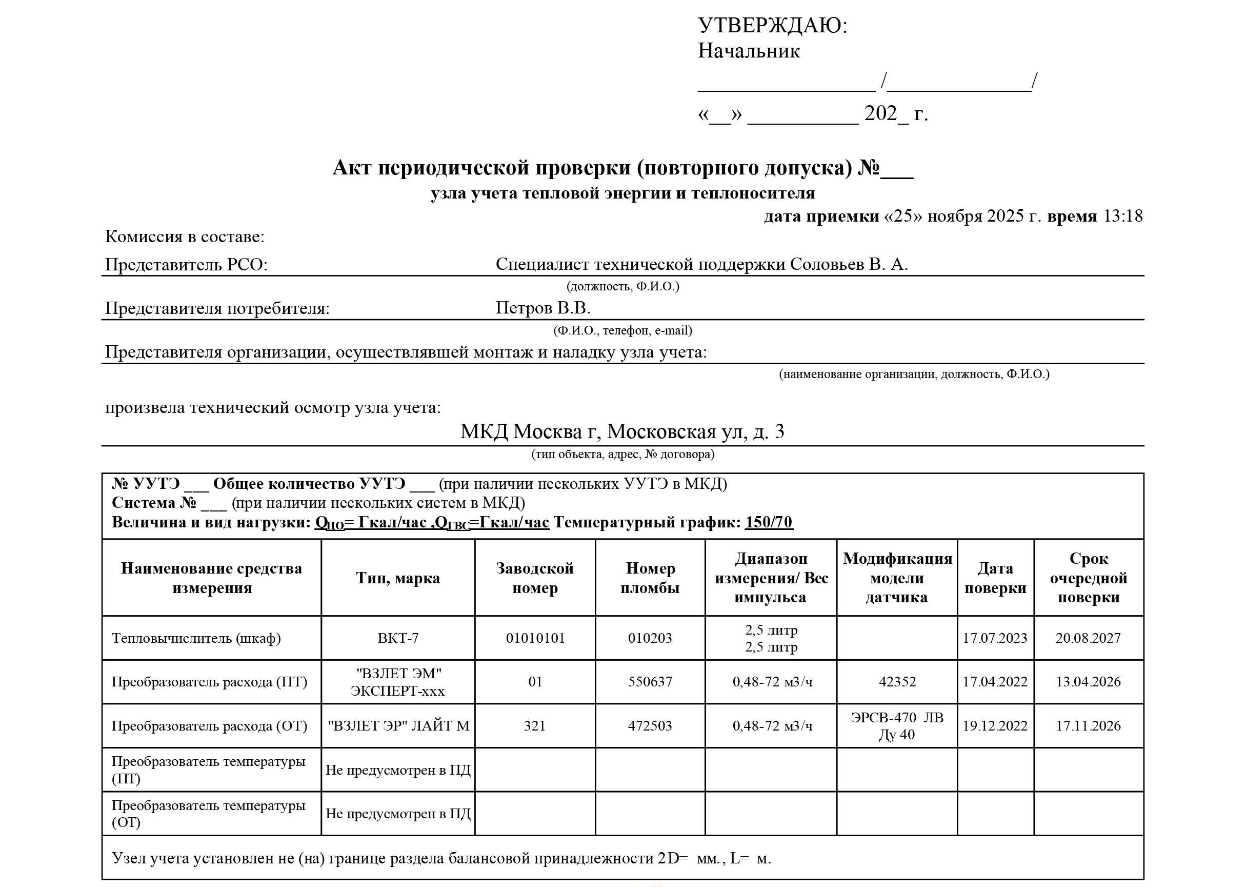 В акте периодической проверки (повторного допуска) узла учёта тепловой энергии и теплоносителя указываются представители ресурсоснабжающей организации (РСО), потребителя и организации, выполнившей монтаж и наладку узла учета, а также адрес объекта. Далее приводятся технические параметры: величина и вид нагрузки, температурный график.