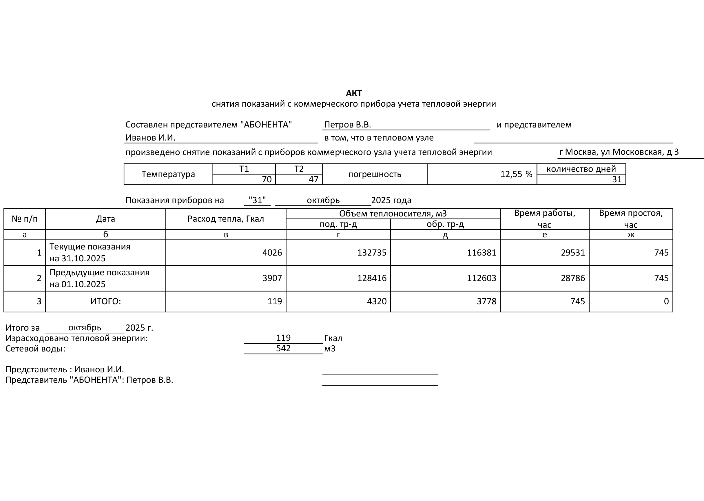 Акт формируется на основе суточного архива унифицированных данных, полученных с коммерческого прибора учета тепловой энергии. Документ фиксирует показания на начало и конец отчетного периода, а также отображает фактический расход тепловой энергии за указанный период без проведения досчетов. Акт служит первичным документом, отражающим объективные данные о потреблении.