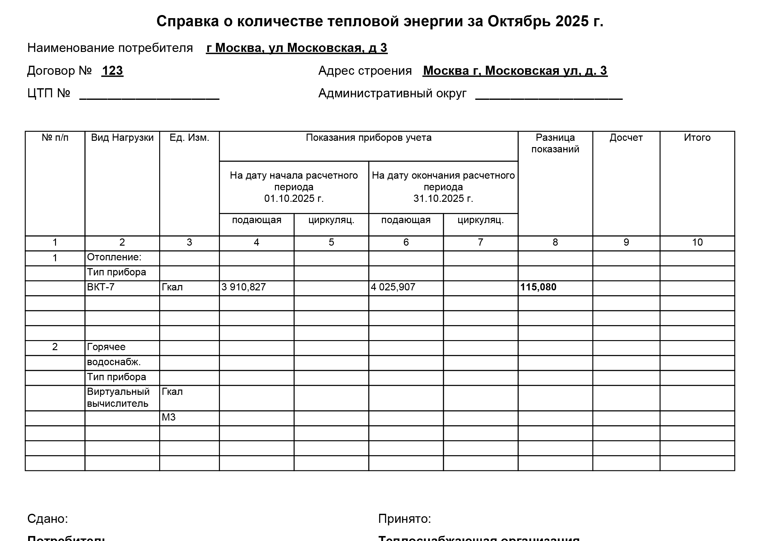 Справка о количестве тепловой энергии МОЭК формируется на основе суточного архива унифицированных данных и является официальным документом, фиксирующим объем потребления тепловой энергии. Она предоставляет структурированную информацию, необходимую для прозрачных расчетов между потребителем и поставщиком.