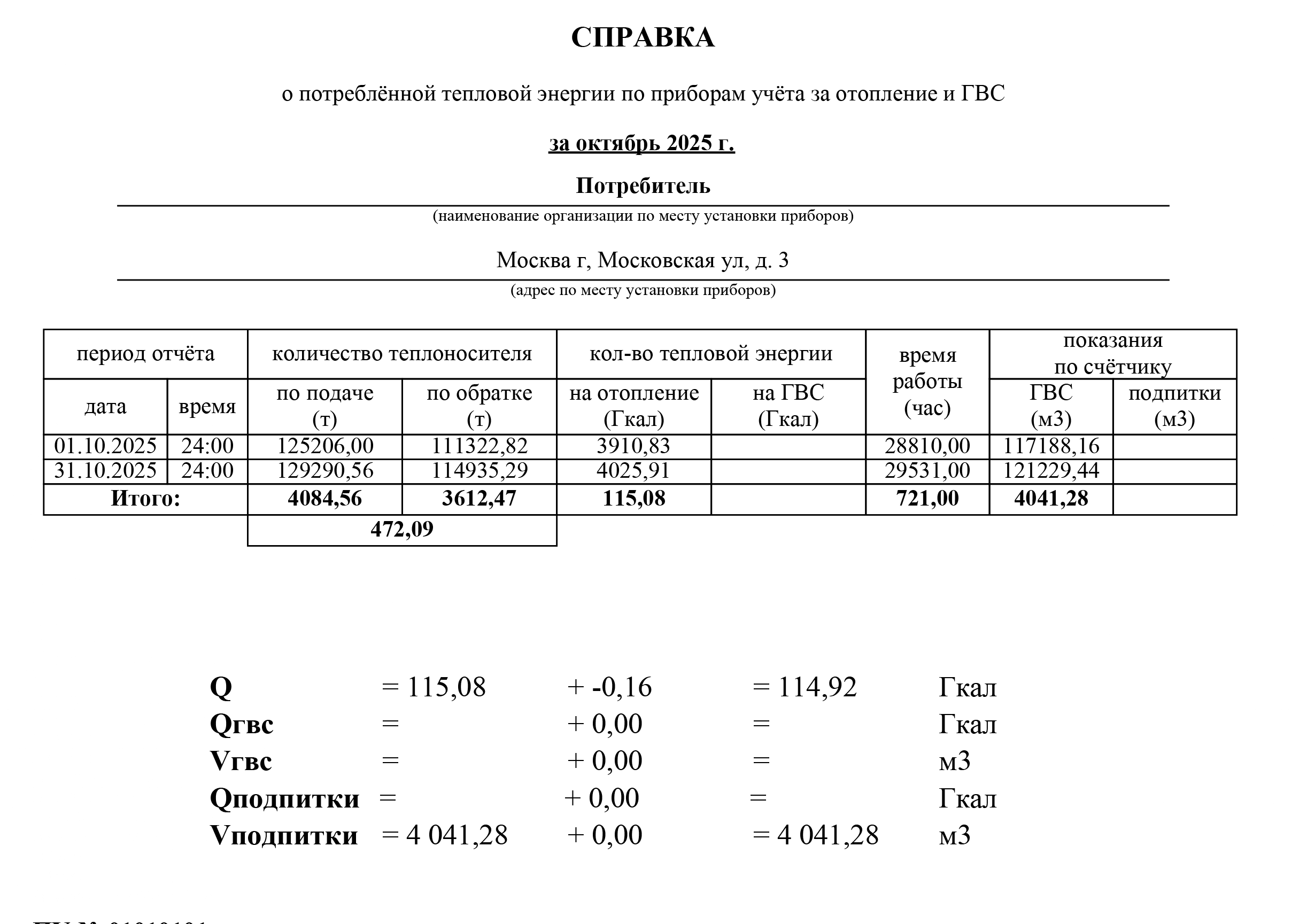 Итоговая часть справки содержит сводные данные: суммарное количество тепловой энергии, тепловой энергии ГВС, объема и массы подпитки за весь период. Также здесь указываются серийный номер прибора, общие итоговые суммы по тепловой энергии и подпитке, номер и дата акта допуска узла учета.