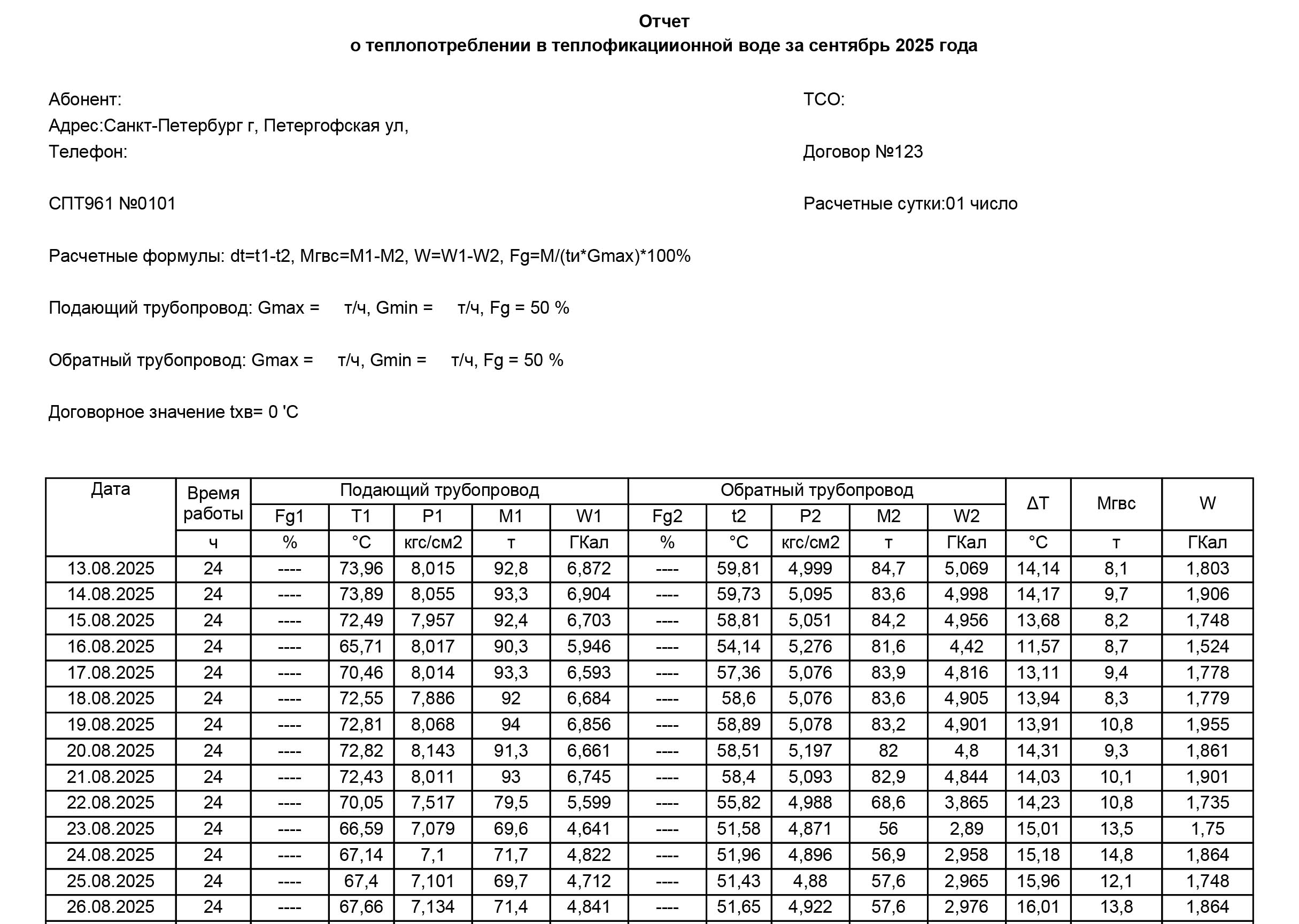 Стандартный отчет СПТ96Х содержит комплексную информацию, необходимую для полного анализа работы узла учёта. В документе указывается период, за который сформирован отчёт, а также подробные сведения об абоненте: название организации-потребителя, адрес объекта, номер телефона и информация о представителе теплоснабжающей организации (ТСО/Инспектор РСО). Обязательно указывается номер договора с ресурсоснабжающей организацией, что обеспечивает юридическую корректность документа.