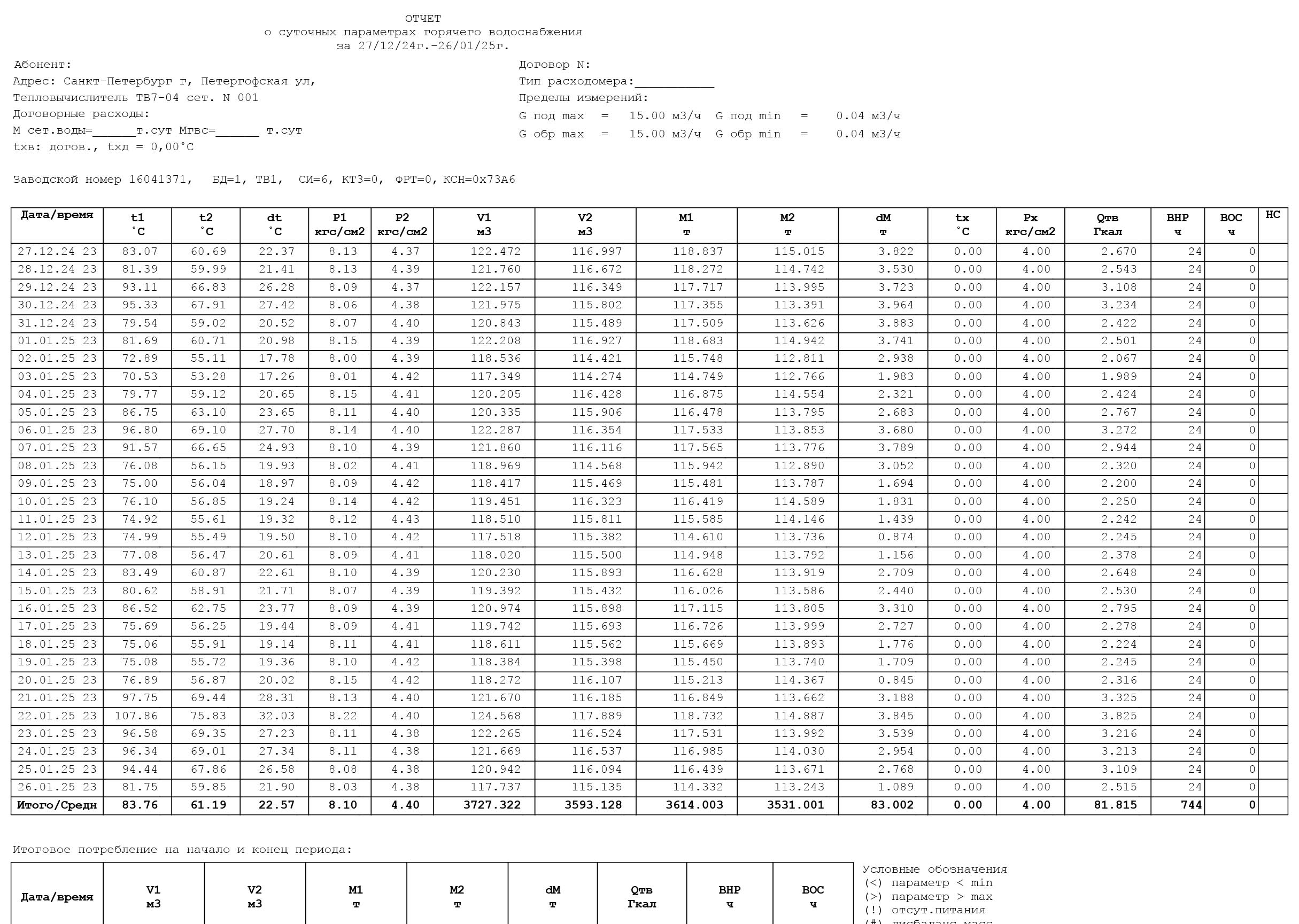 Для обеспечения достоверности данных в отчёт включена контрольная сумма прибора. Детализированная часть отчёта состоит из таблиц с данными и таблицы интеграторов на начало и конец отчётного периода, что обеспечивает полный охват анализируемого интервала. Завершают отчёт подписи представителей абонента и снабжающей организации, что придаёт документу официальный статус и юридическую силу для использования в качестве основания для взаиморасчётов.