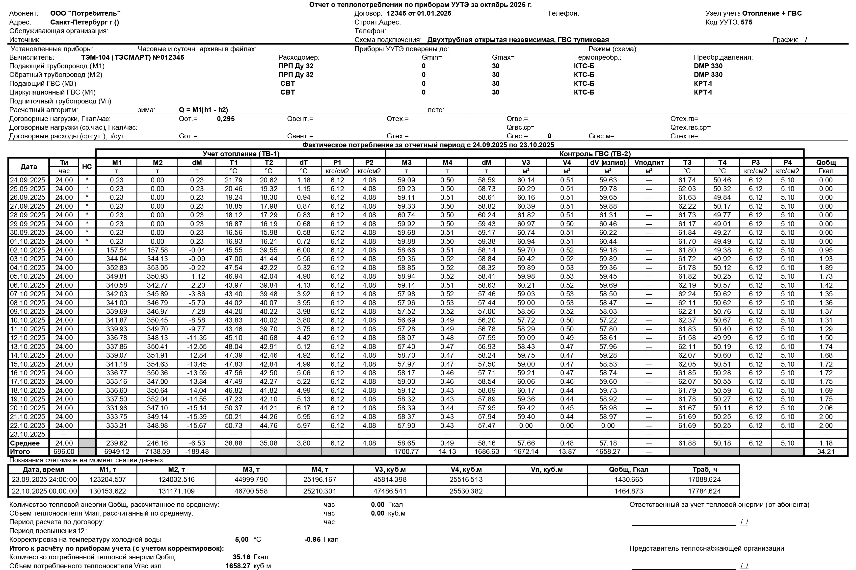 Наиболее объёмным является раздел расчётных данных и показаний. В нём представлен расчётный алгоритм, отдельно для зимнего и летнего режимов работы системы, и приведены договорные нагрузки и расходы. Основу раздела составляют детализированные таблицы: суточных данных за каждый день отчётного периода и значений интеграторов на начало и конец этого периода. Кроме того, здесь фиксируются значения общей тепловой энергии и объема теплоносителя Vизл, период расчёта по договору и период превышения температуры t2. Раздел также включает все необходимые корректировки, в том числе на температуру холодной воды, и подводит итог к расчёту по приборам учёта с их учётом.