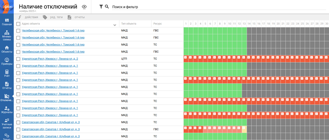 - Восклицательный знак в ячейке — сигнализирует о разночтении: система зарегистрировала отключение по приборам, но запись не создана, или наоборот. Кликая на ячейку, пользователь видит детализацию и может оперативно создать недостающее отключение прямо из этого интерфейса.