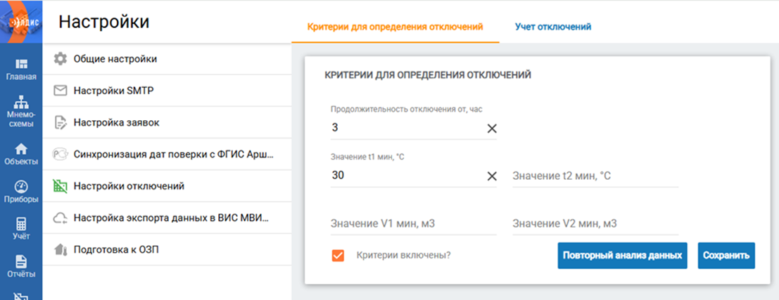 Одна из ключевых возможностей модуля — автоматическое определение отключений на основе показаний приборов учета. Для этого необходимо настроить критерии в виджете: