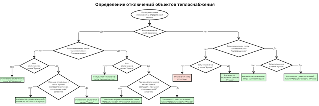 - Определение включения объектов теплоснабжения. Представляет собой алгоритм, в котором в зависимости от разных ситуаций используется то или иное отключение (созданное пользователем или загруженное из сторонней системы).