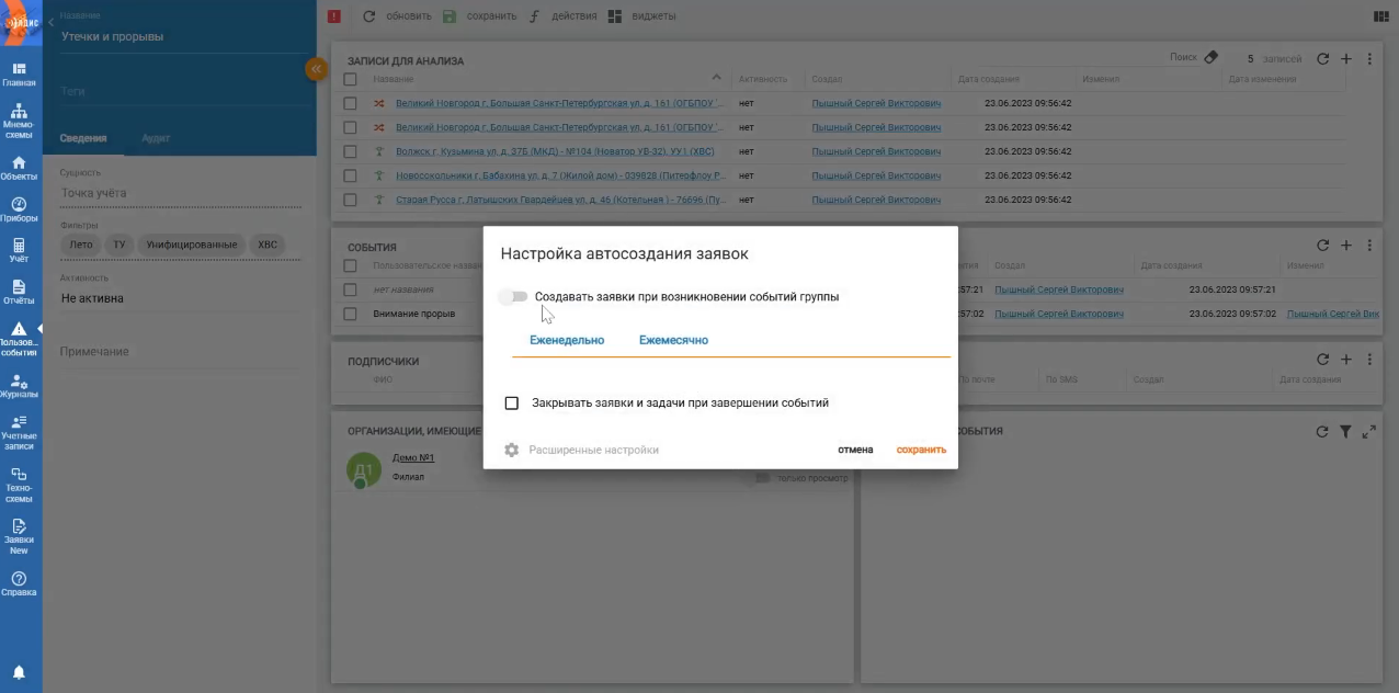 После активации параметров система в фоновом режиме анализирует поступающие данные. При выявлении несоответствий автоматически генерируется заявка, что позволяет приступить к устранению неполадки до того, как потребитель пожалуется, или предотвратить развитие аварийной ситуации.