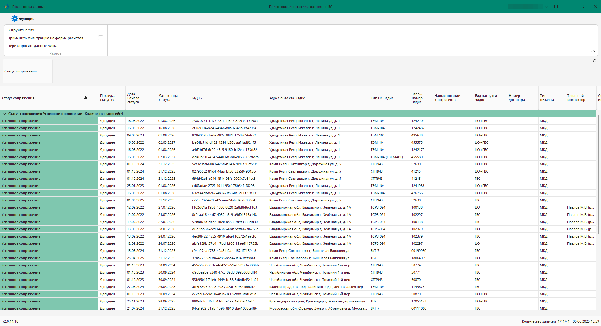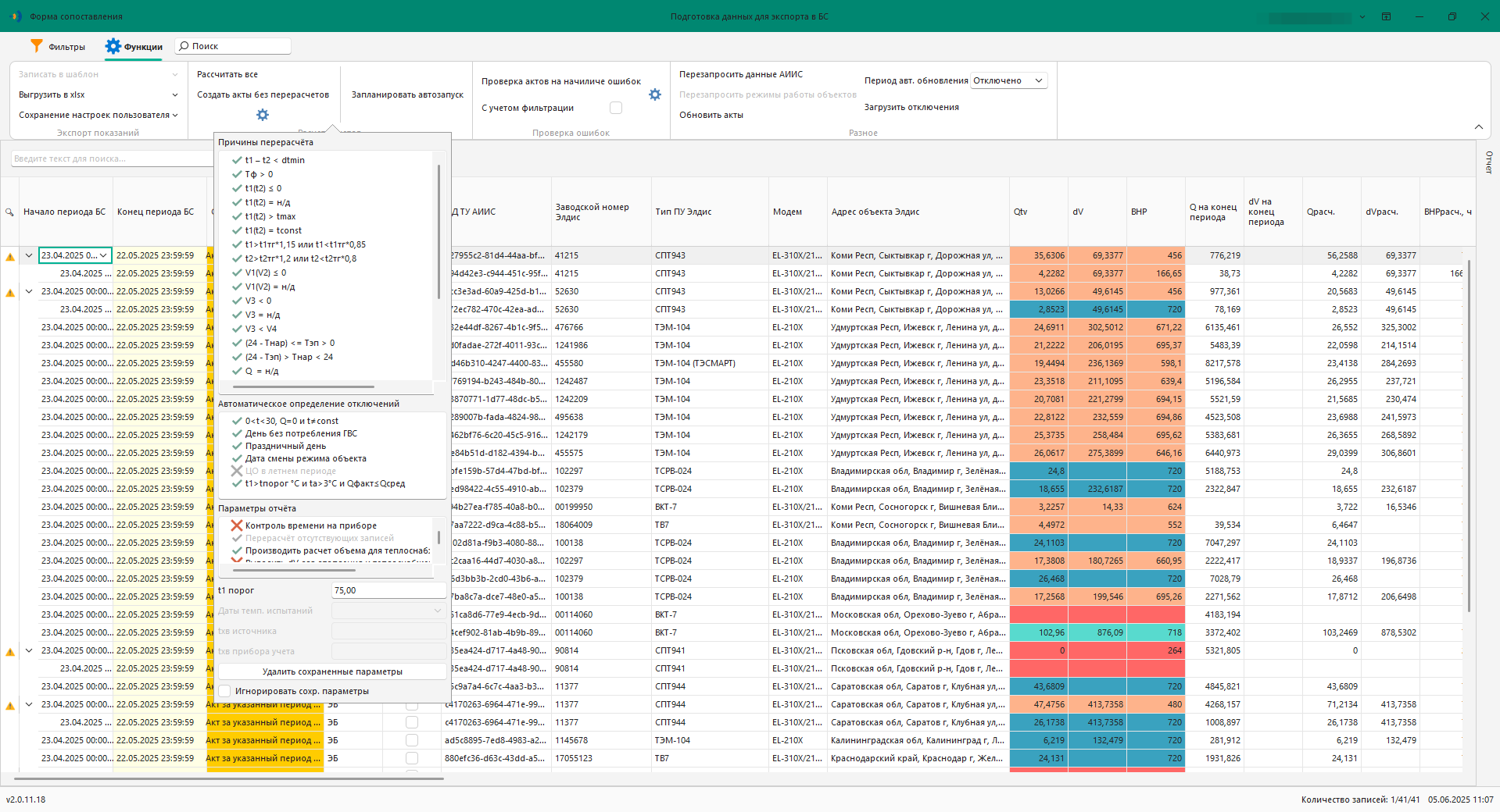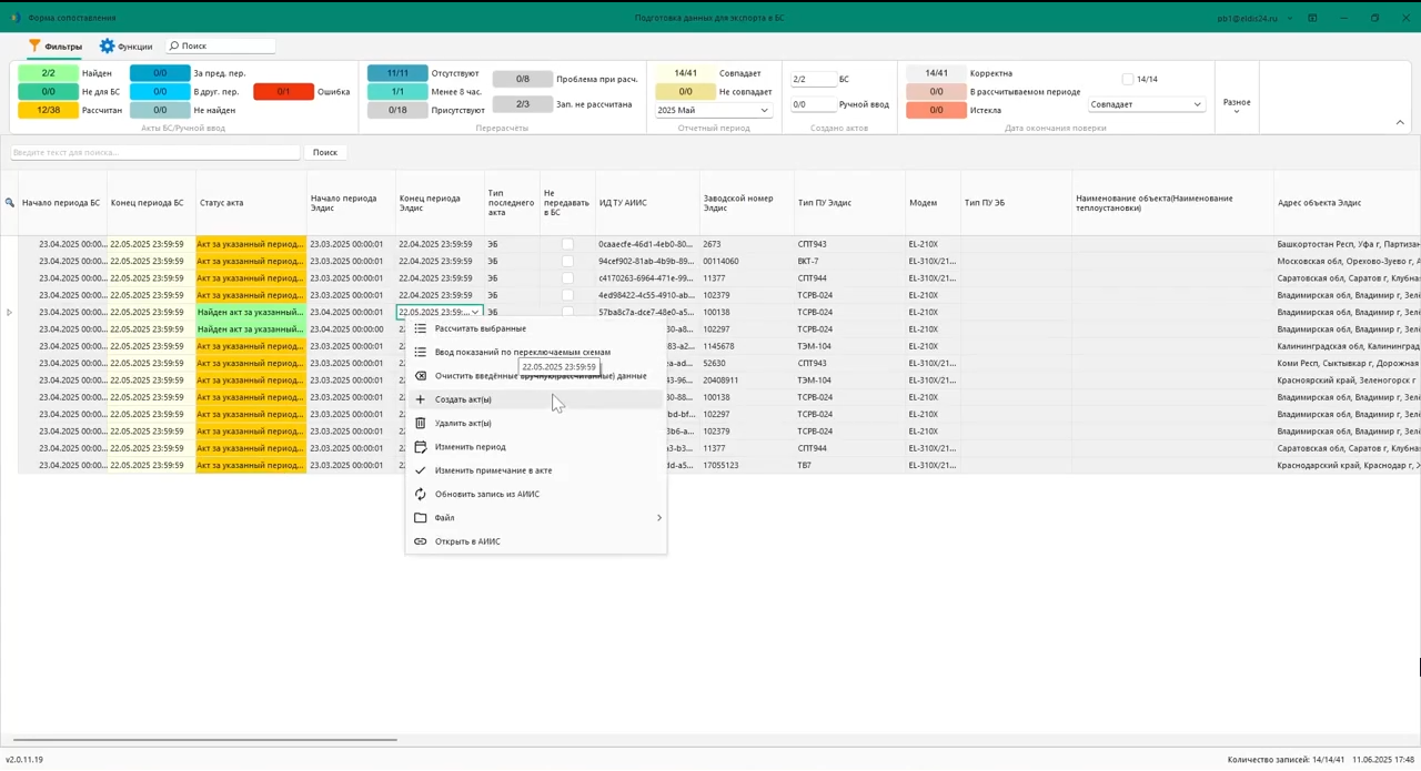На первом этапе из биллинговой системы формируется список точек учета с указанием последних показаний и сроков поверки приборов. Этот список загружается в модуль предбиллинга, где выполняется автоматическое сопоставление с объектами и узлами учета, зарегистрированными в АИИС Элдис.